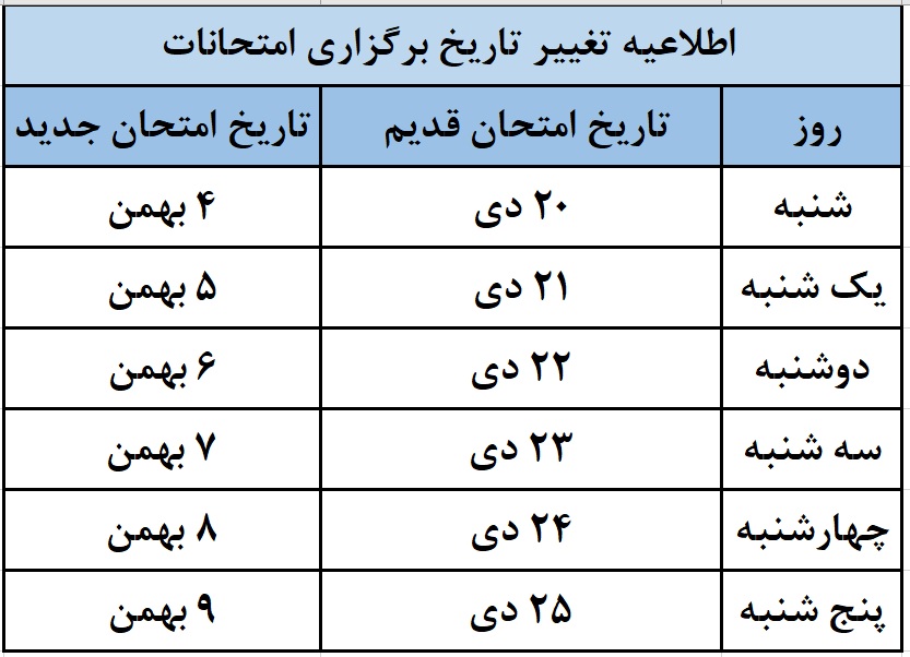 اطلاعیه تغییر تاریخ برگزاری امتحانات پایان ترم